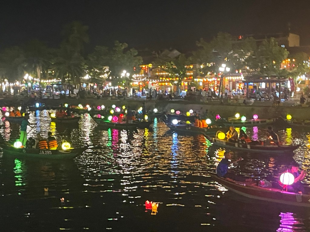 La sera le lanterne si accendono, i turisti escono a passeggiare a centinaia, i bar sparano musica a tutto volume, le barche fanno avanti e indietro portando in giro i turisti, tra le lucine delle candele che vengono calate nel fiume come durante la tradizionale festa della luna. Ormai, per accontentare i turisti e fare più soldi, ogni sera è una festa della luna.