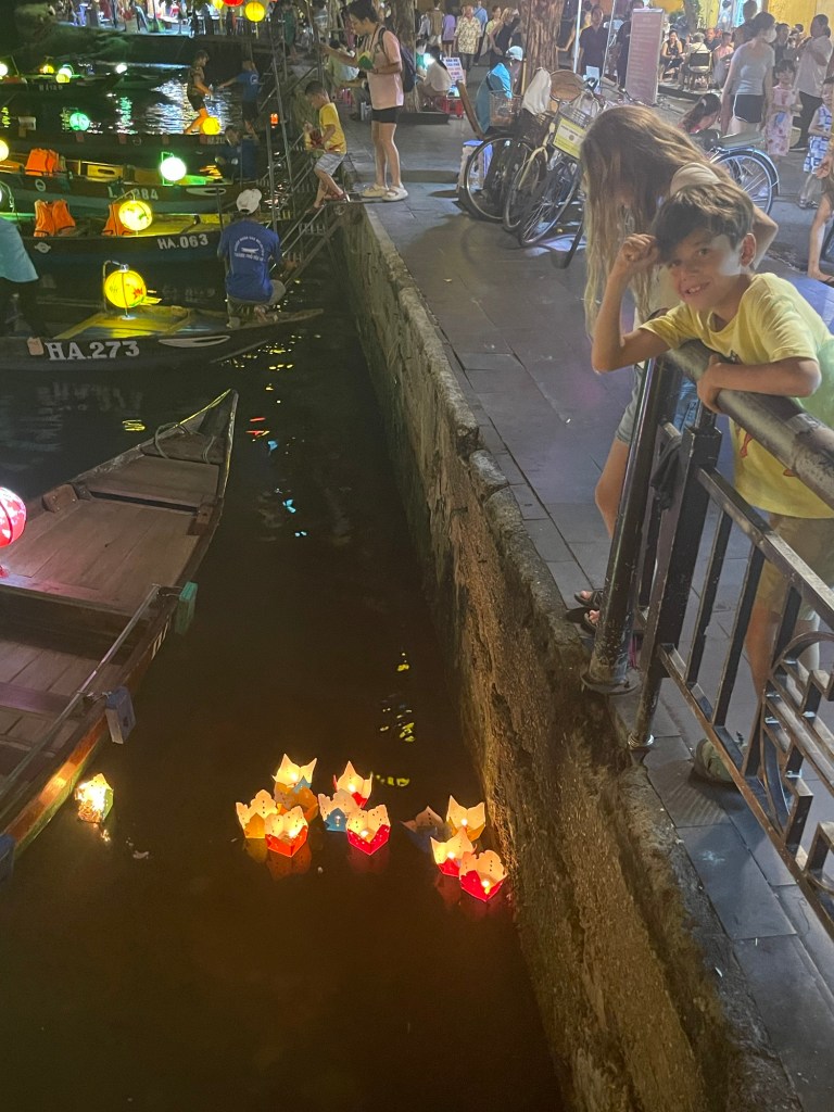 Dopo aver fatto le mie considerazioni su Hoi An, voglio però raccontare di come l’hanno vissuta i miei figli. A loro la città è piaciuta molto! In effetti, vista con gli occhi di un bambino, come non amare le stradine piene di lanterne colorate che la sera si accendono! E la tradizione di calare delle candele nel fiume e guardarle andare via, tra decine di altre. I bambini hanno visto solo la magia di Hoi An, senza domandarsi se fosse autentica o meno.